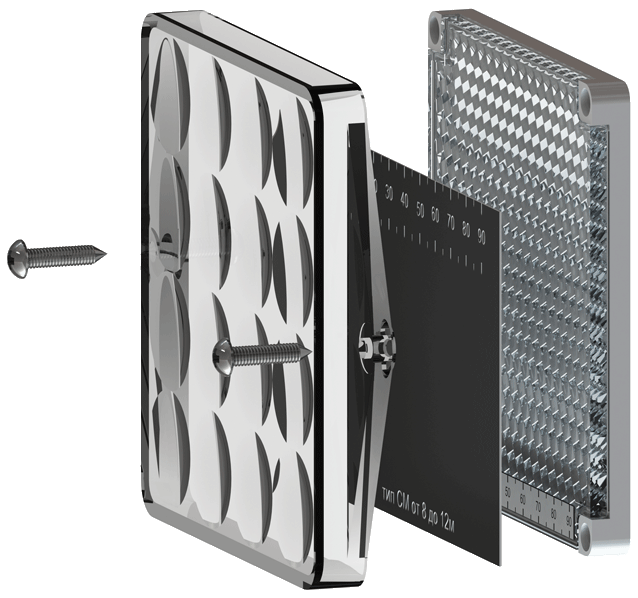 Приведенные рефлекторы-отражатели имеют условное название «большой»(тип Б). Кроме него однокомпонентные извещатели могут комплектоваться «малым» (тип М) и «супермалым» (тип СМ) рефлекторами-отражателями. Сборка комбинированного отражателя типа СМ показана на рисунке. В зависимости от дистанции (5 - 8 м) или (8 - 12 м) используются разные аттенюаторы.