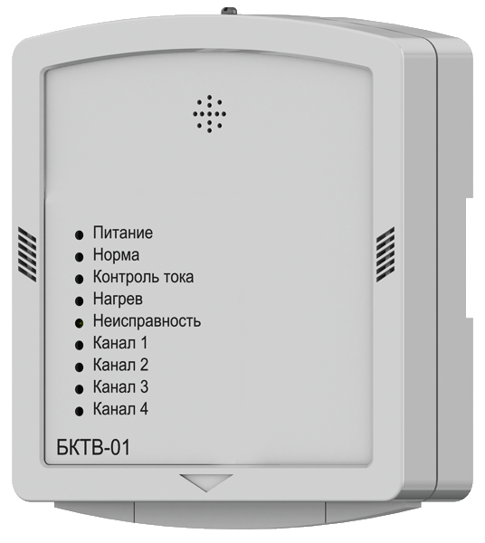 Блок БКТВ-01 предназначен для подачи питания на рефлекторы-отражатели с подогревом (тип Б-П) и обеспечивает применение энергосберегающих технологий при защите линейных извещателей от ложных срабатываний из-за выпадения росы или инея на поверхностях оптических элементов. Внешний вид блока приведен на рисунке 1.